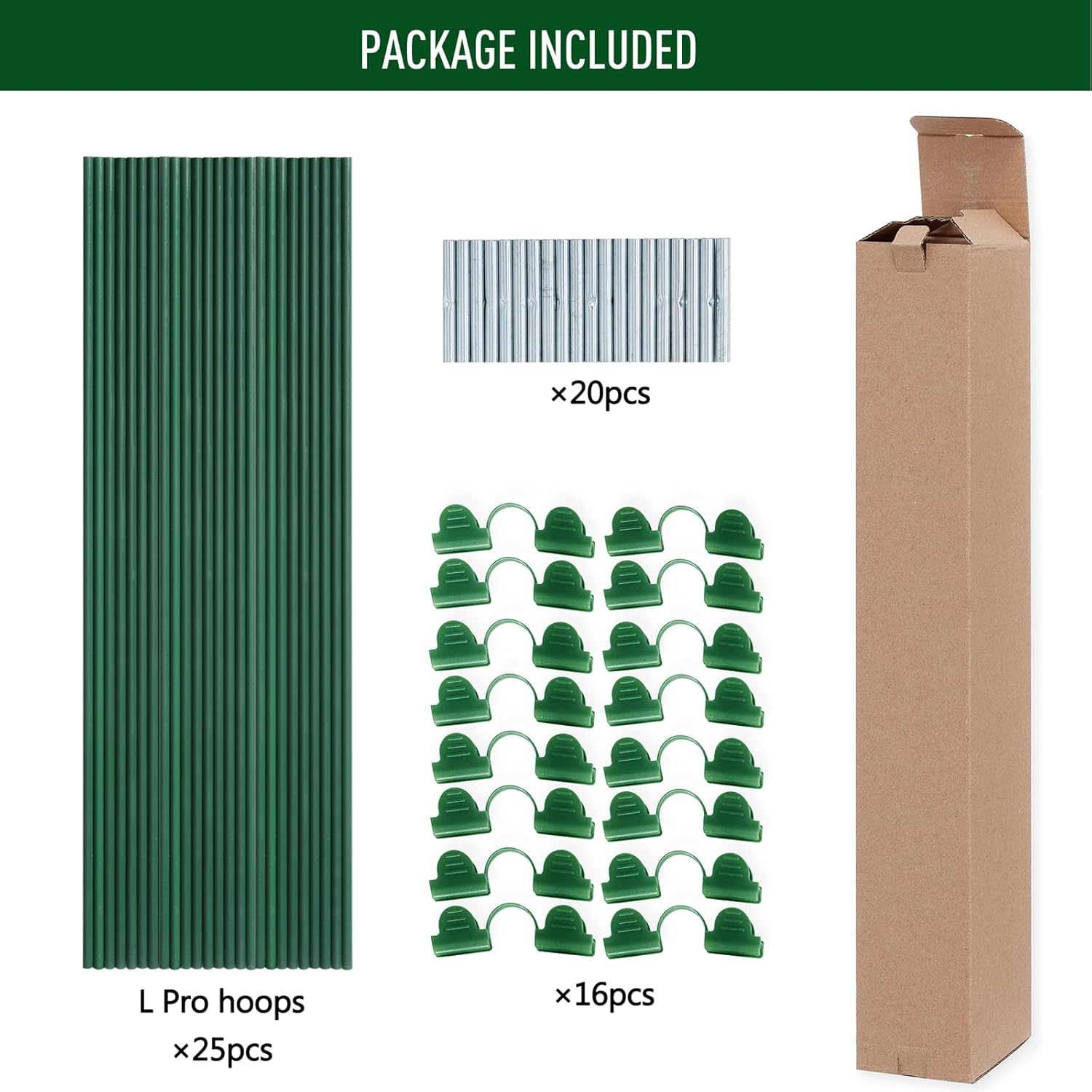 - 【DIY KIT】Comes with 25 large diameter hoops, each 17" long, 20 connectors, and 16 clips. You can combine 5 or more hoops to DIY your own grow tunnel. Additionally, you can use the clips to secure the greenhouse covering.