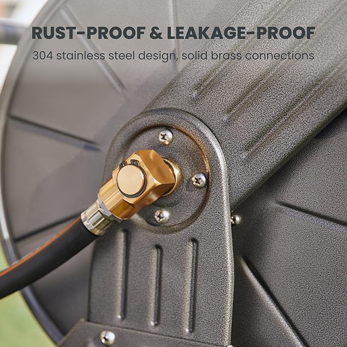 - All-weather Construction: Heavy duty metal frame is coated with special powder finish, making the garden hose reel cart suitable for all weather. The solid brass connector makes the garden hose leakage-proof and wear-resistant.