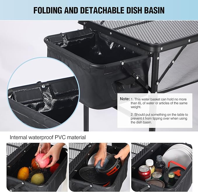 - [Large Storage Space] The table has a detachable mesh bag and a dish basin for storage. Keep small items in the bag and use the tabletop for the grill, food, or cards.