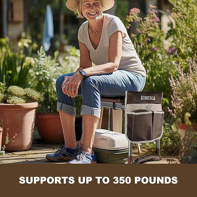 - Unbreakable, Foldable, and Ready-to-Go! Our garden kneeler is as sturdy as your grandma's oak tree swing, supporting up to 350 pounds with ease.. It's ready-to-use, no assembly required โ just unfold, and voilร ! And, guess what? It's not just a kneeler; it's a garden stool too! Snap-lock it, and you're all set for a throne-like experience. Aimerla Kneeler: making gardening chic and a breeze. Aimerla Kneeler: making gardening chic and a breeze