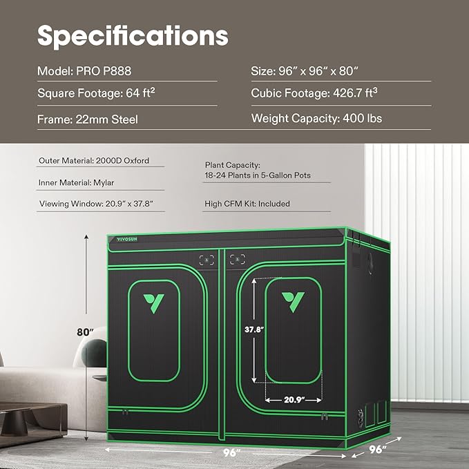 VIVOSUN P888 96"×96"×80" PRO Grow Tent, with Thick 1 inch Poles, Strengthened High Reflective Mylar Oxford Fabric, Extra Hanging Bars & High CFM Kit for Hydroponics Indoor Plant for VS4000×4