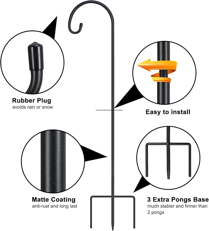 - 【3 Base Prongs】This shephards hook has 3 long prongs at the bottom for better grip. Compared with ordinary 2 prongs products, it has higher stability and firmness. Even in bad weather, it can still stand upright and is not easy to fall down. We have thickened the metal pole, which not only increases the maximum bearing capacity, but also extends its service life.