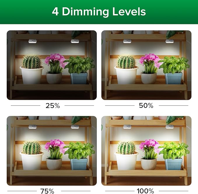 - 4/8/12 HRS AUTO ON/OFF TIMER & 4 DIMMING LEVELS: The LED 2-head grow light operates from a built-in timer with 3 modes cycle timing function which stays on for 4/8/12 hours and off for 20/16/12 hours. The indoor plant lights for indoor plants full spectrum offer 4 level brightness settings to different plants requirements ranging from 25%, 50%, 75% to 100%