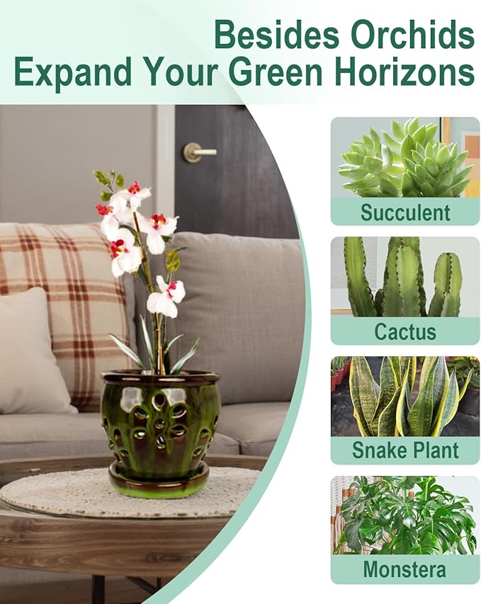 - 【 Perfect Air Flow and Drainage 】 The ceramic orchid pots side body have specially designed multiple holes for promotes air circulation and it has drainage hole in the bottom help for better drain and benefit for root grow healthy. Orchid pot with attached saucer could collect excess water keep your planting place cleaning
