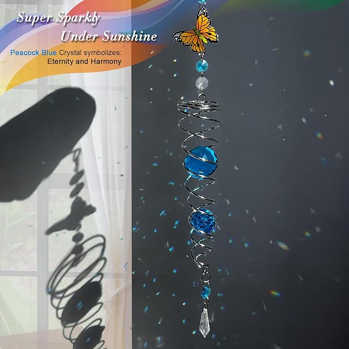 - 【HIGH QUALITY】:FONMY butterfly Crystal wind spinner sun catcher is made of stainless steel wire with K9 crystal material, special double structure spiral tail w/ solid color K9 crystal glass ball,promised good weather resistant and amazing decoration. All FONMY crystal ball made of top crystal glass material with finely crafted, high clarity and cast beautiful rainbows, could turn the sun's rays into many rainbows.