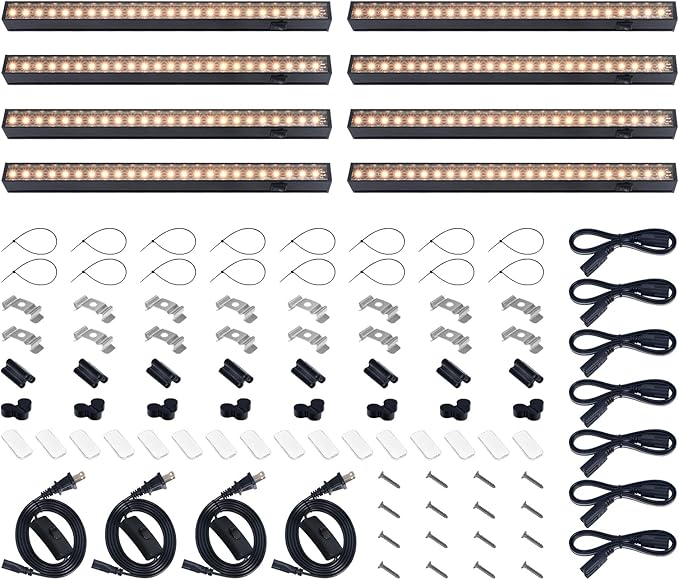 - Easy Installation: With included clips, cable ties, magnetic bar with double-sided tapes, you could install this indoor plant light by yourself in minutes. Our under cabinet grow lights can be directly attached to any magnetic surface and any non-magnetic surface. Plug and play, and you could link up to 16 lights in a series