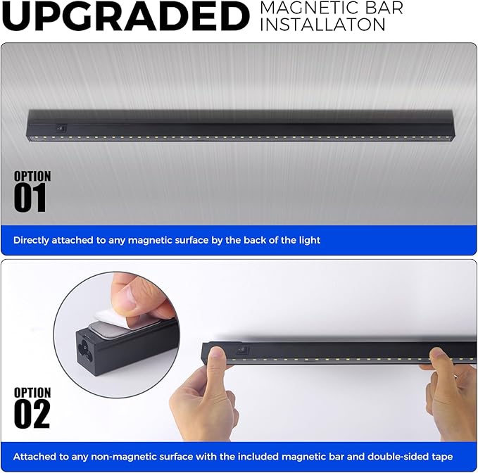 - Easy Installation: With included clips, cable ties, magnetic bar with double-sided tapes, you could install this indoor plant light by yourself in minutes. Our under cabinet grow lights can be directly attached to any magnetic surface and any non-magnetic surface. Just plug in and light up, and you could link up to 16 lights in a series