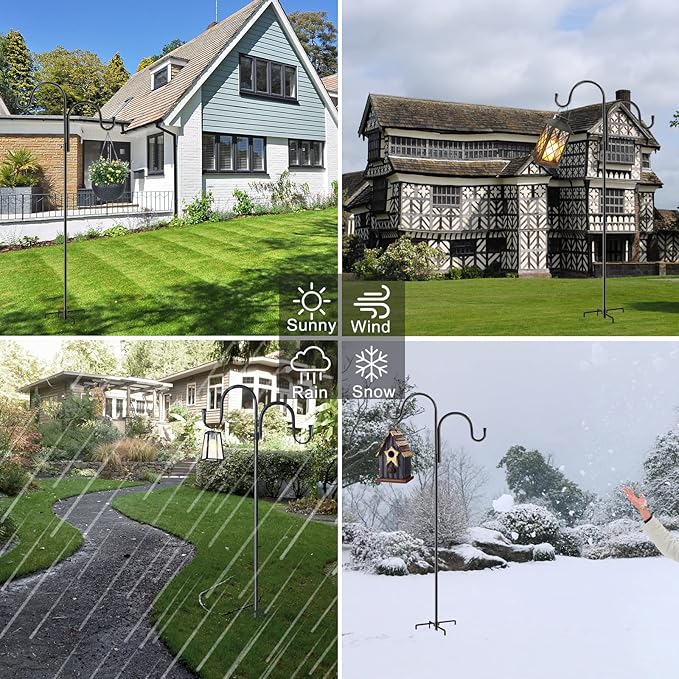 - 【Premium Quality】:The heavy duty shepherd hook is made of 1.5mm thick double hook steel pipe.The shepherds hook for bird feeder is surface with black powder coating to prevent rust,durable last for years.