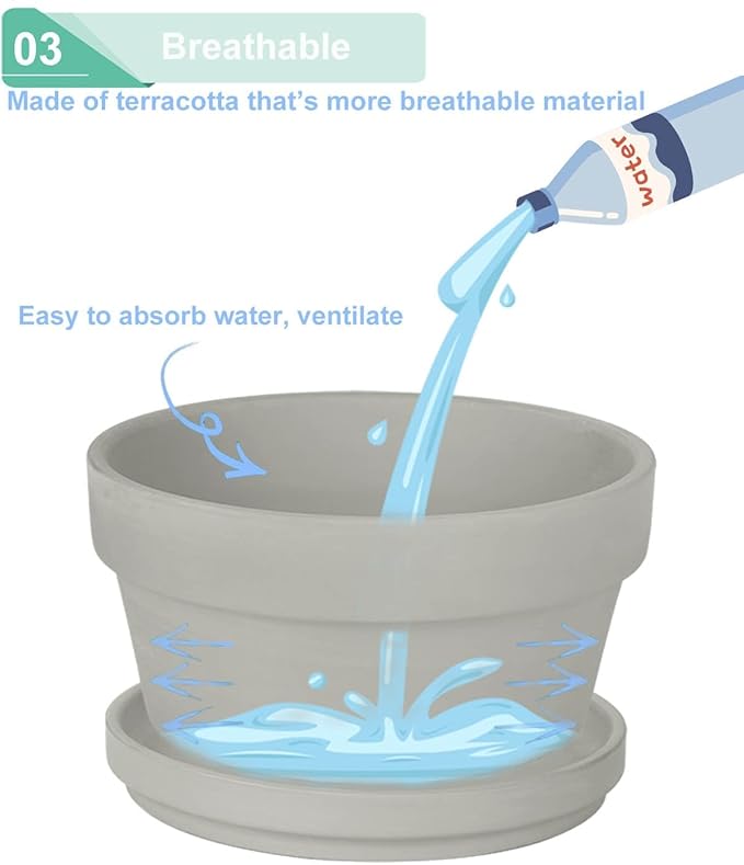 - Quality Materials: Terra cotta pots Making from high-quality clay through high-temperature baking, the walls of the pots draw the water out of the soil to help the soil dry quicker.