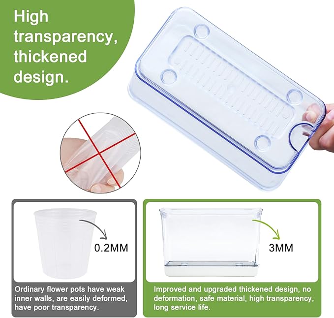 - ๐๐The double-layer design allows excess water to be stored at the bottom of this plant pots. Water is separated from liner, only absorbed by cotton. This pot is made of high-definition transparent material, There is a special water injection port for easy water injection and maintain air circulation.