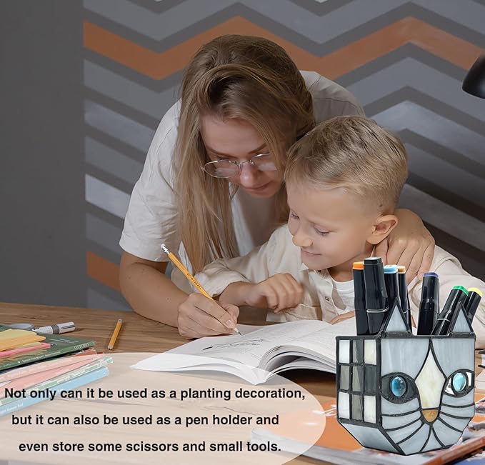 - Looking for a unique and beautiful way to display your plants;Tiffany's Adorable Cat Stained Glass Planter; Made with a corrosion resistant pure copper frame, these pots are not only functional but also beautiful. Each flower pot is handcrafted and can be used for planting, dried flower arrangement, candle holder, pen or cosmetic brush holder and so on. Perfect for decorating your dining table, living room, or anywhere else you want to add whimsy and charm