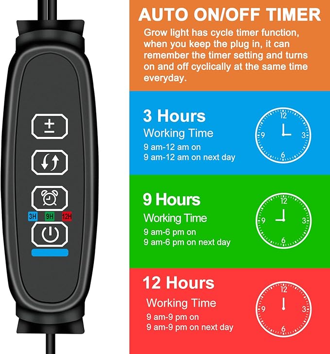 - Timer and Dimmer Function:This indoor seedling light offer the circular memory timer function with 3 options-3/9/12H. When keeping power, it can automatically turn on and off every day according to your settings.ใ You Could Operate One of Them Separately and Support 10 Levels of Dimming.ใ
