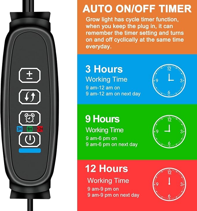 - Timing and Dimming Function:This indoor seedling light offer the circular memory timer function with 3 options-3/9/12H. When keeping power on , it can automatically turn on and off every day according to your settings.ใ You Could Operate One of Them Separately and Support 10 Levels of Dimming.ใ