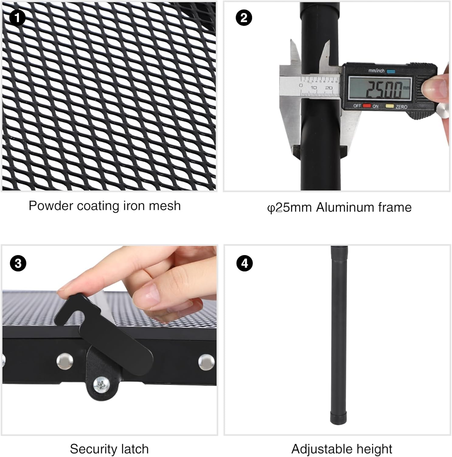 - [Superior Material] The table top of this folding aluminum grill table is made of powder coating iron mesh, which is wear-resistant for long time use. Its frame are constructed by φ25mm aluminum alloy tubes, giving enough support to the table.