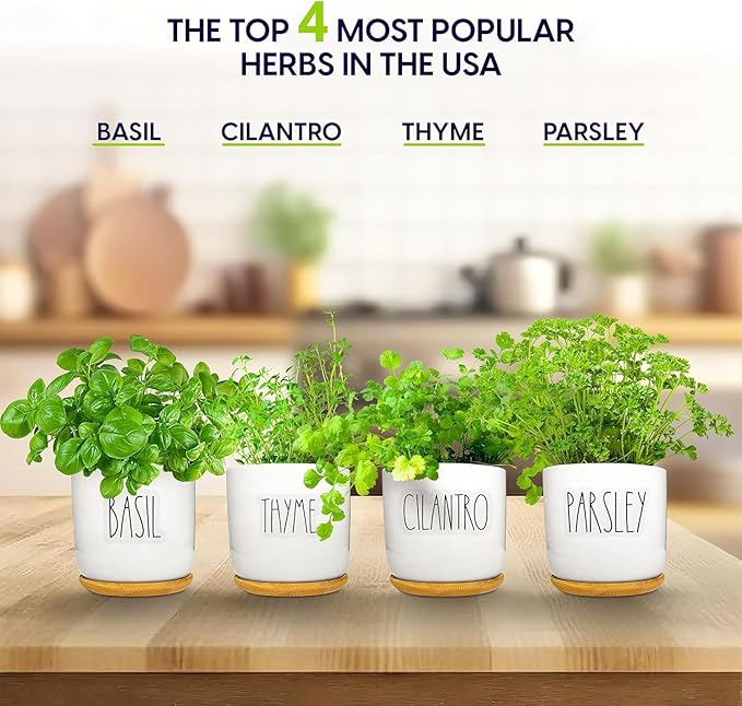 Deluxe Ceramic Indoor Herb Kit 4 Set. Variety Herbs for Indoor & Outdoor – Get Growing with Pots, Potting Soil for Window Herb Garden. (Ceramic Edition)
