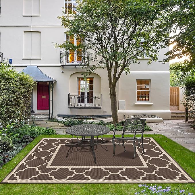 GENIMO Outdoor Rug 8' x 10' Patio Waterproof, Foldable Reversible Plastic Straw Area Rugs Mat for Camper Decor, Outside Carpet for Rv, Deck, Porch, Picnic, Beach, Balcony, Coffee & Beige