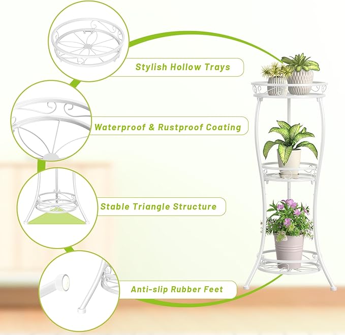 - 【Sturdy & Stable Structure】: Our 3 tier plant stand indoor tall is constructed out of reliable iron, designed with 3 strong support rods to increase the stability. Each shelf can bear up to 44lb/ 20kg, and the overall load can be up to 132lbs/ 60kg.