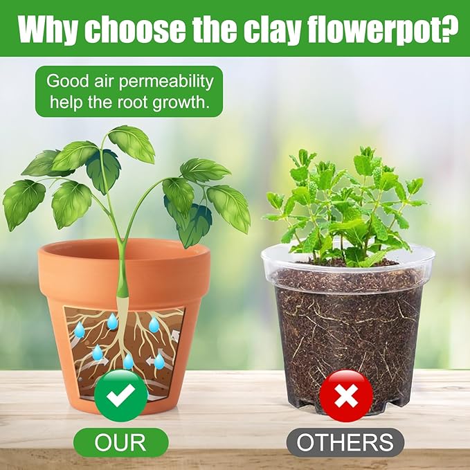 - 【High Quality Material 】Made of Top-Quality clay and baked at 980℃ high temperature, each terracotta pots features great durability and crack resistance ,and very smooth surface while maintaining good breathability. There is a small drainage hole at the bottom of each small terracotta pots to drain and ventilate, which can effectively prevent the roots of plants from rotting and make plants grow healthier.