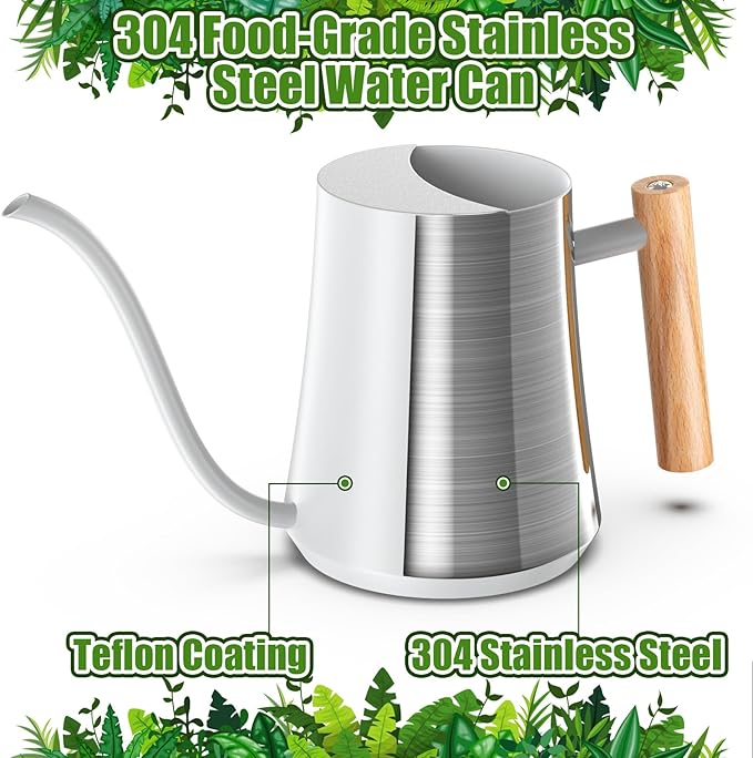 - 【COMFORTABLE WOODEN HANDLE】Our indoor watering can has a round comfortable wooden handle. It is easy to grasp and won't hurt your hands. Also, our stainless steel watering can has a built-in open-top design, which is convenient for refilling water.an exquisite and light body design, our watering pot serves as a decoration.