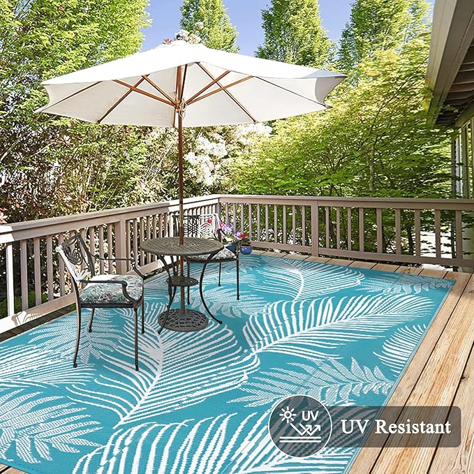Pauwer Waterproof Outdoor Rug 8x10, Reversible Plastic Straw Patio Camping Rug, Indoor Outdoor RV Mat Carpet for Deck, Camper, Porch, Balcony, Backyard, Picnic, Leaf Teal