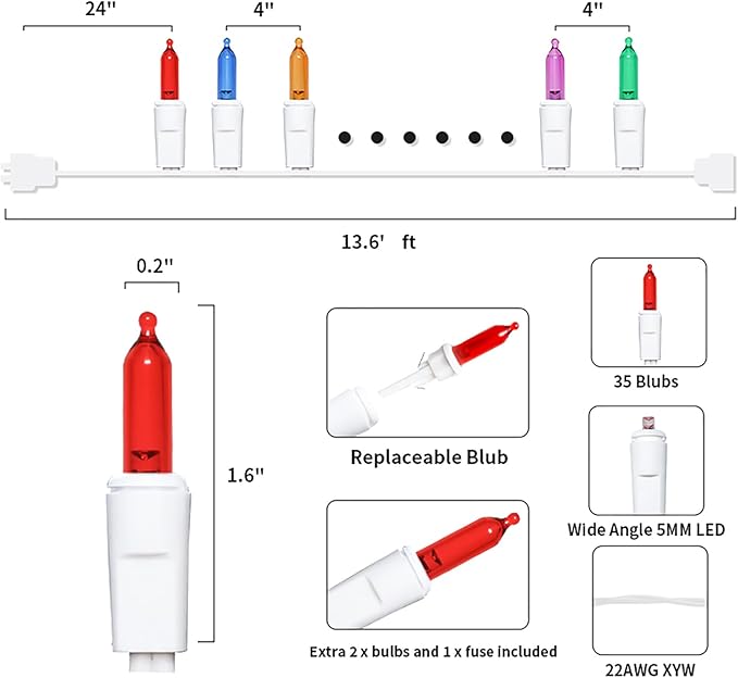 - 【Mini Christmas Lights Specification】: 1 Sets - white wire chritsmas light string includes 35 count multicolor LED lights, total length 13.6ft, lights length 11ft and each led is 4 inches apart, 24 inches lead wire, 4 inches end connector (Extra 2 x bulbs and 1 x fuse included)