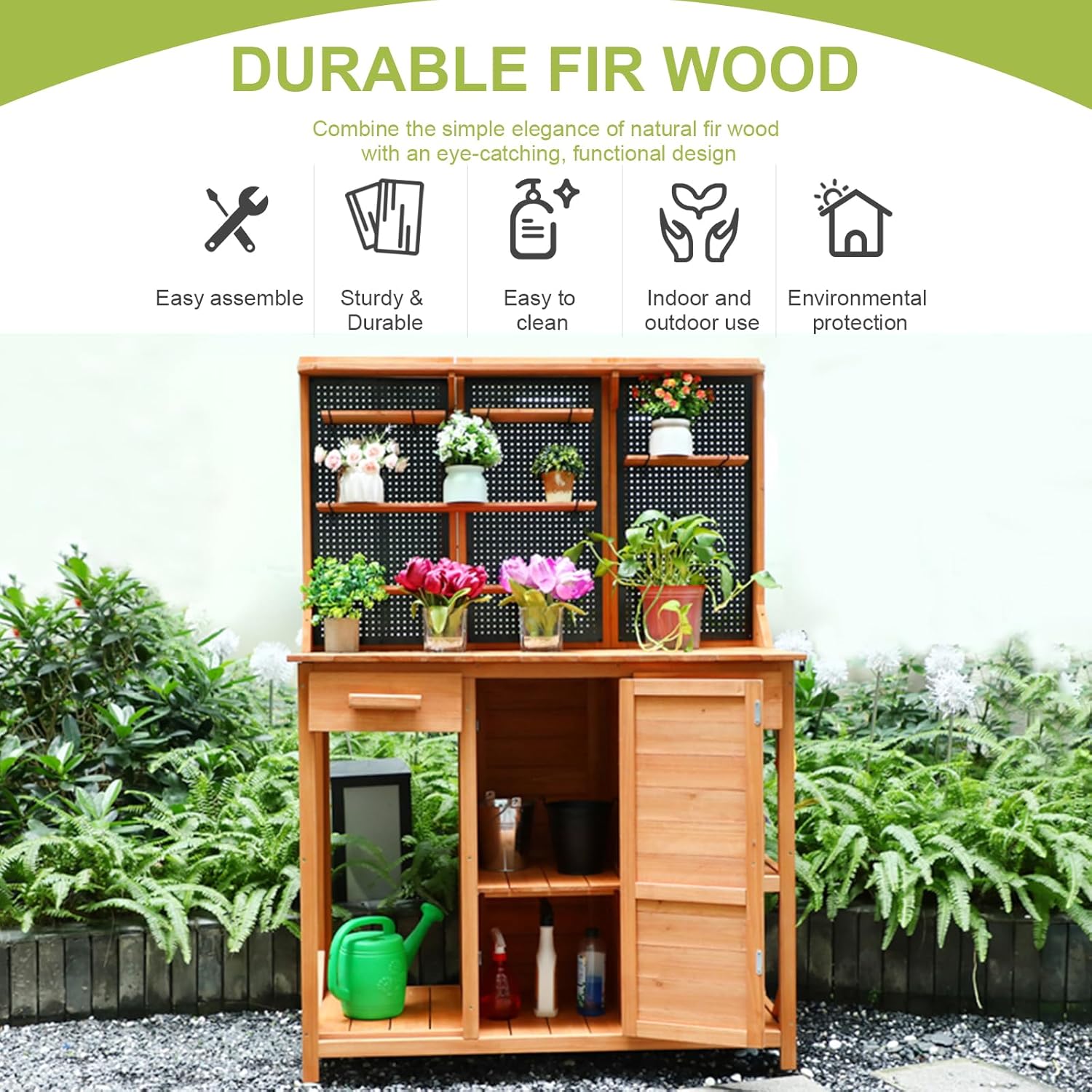 Outdoor Garden Potting Bench, Horticultural Wooden Workstation Table with Storage Drawer, Cabinet, Metal Pegboard, Adjustable Hooks and Shelves for Backyard, Patio, Greenhouse