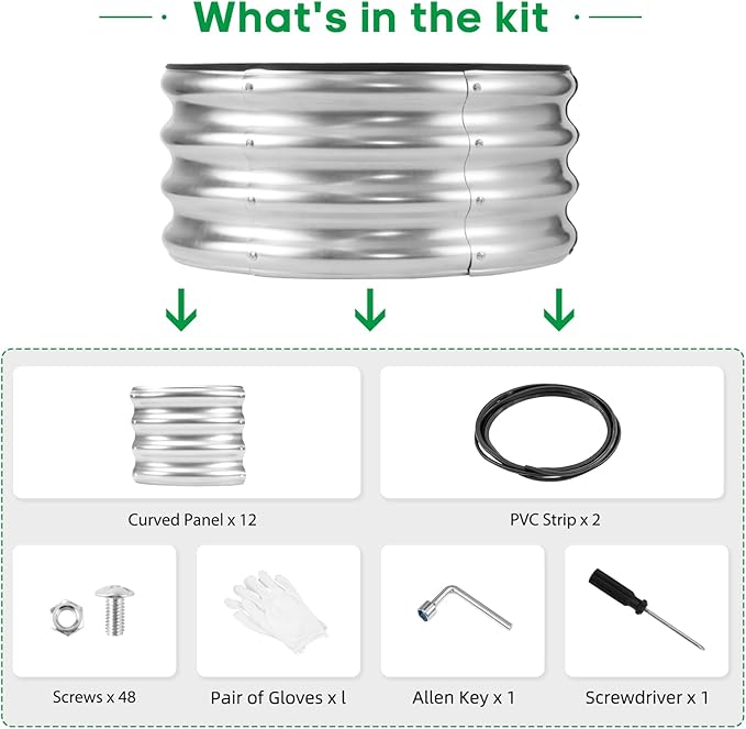 - What You Get: we have included Galvanized raised garden bed kit with detailed assembly instructions, rubber edge strips, safety gloves , wrench tools and with galvanized nuts and bolts in the box .These essential tools elevate your overall planting and gardening adventure.