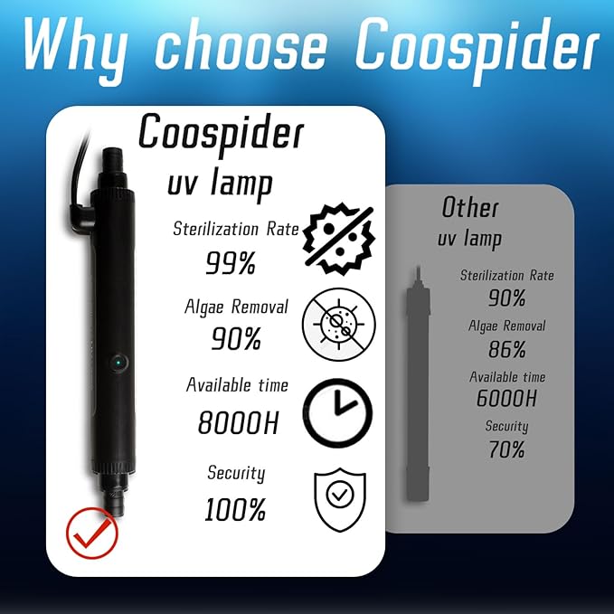 - 【99% Rate】The aquarium UV light utilizes 254nm short-wave UV/UVC germicidal lamps, boasting an efficient rate of 99%. It effectively eliminates green algae, ensuring crystal-clear water. The presence of ultraviolet lamps enhances the filtering effect beyond standard filtration.