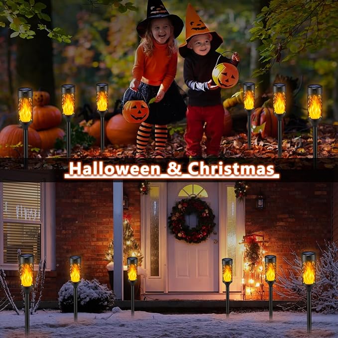 - Solar Outdoor Lights Waterproof: Garden lights solar powered waterproof equipped with enclosed design, can withstand most weather condition like rain and snow, which has better waterproof performance than general solar flame lights on the market. Attractive flickering flame torch lights will provide a warm and cozy atmosphere for your outside decor.