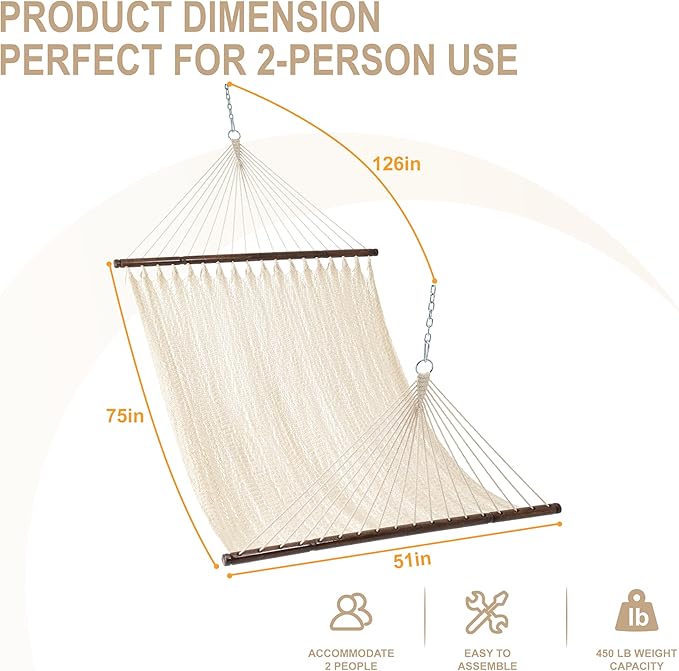 - Whatโs In The Package: 1 Caribbean rope hammock is included in the package (Hammock stand not included) and two chains; Hammock with stylish vintage hardwood spreader bars creates a safer zone for you, 51 inches durable hardwood spreader bar made of FSC-Certified wood; It's easily hanging between two trees or a hammock stand with an "o" ring at each end