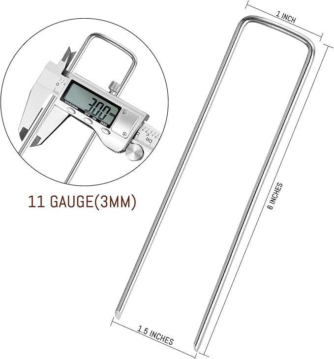 - 【Material And Size】Comes with 50pcs landscape stakes made of durable galvanized iron. These lawn stakes with 6 inches length,11 gauge(3mm) and 1 inch width.