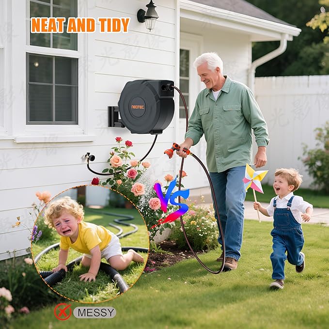 - 【Auto-Retracting System】Retractable garden hose reel with enhanced slow-speed rewind technology. Retractable water hose automatically coils with gentle pull force, cutting watering time by 75% compared to standard water hose reels for outside.
