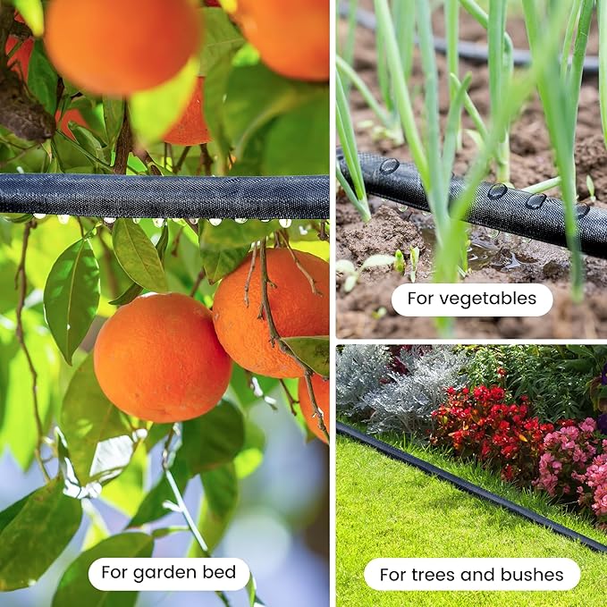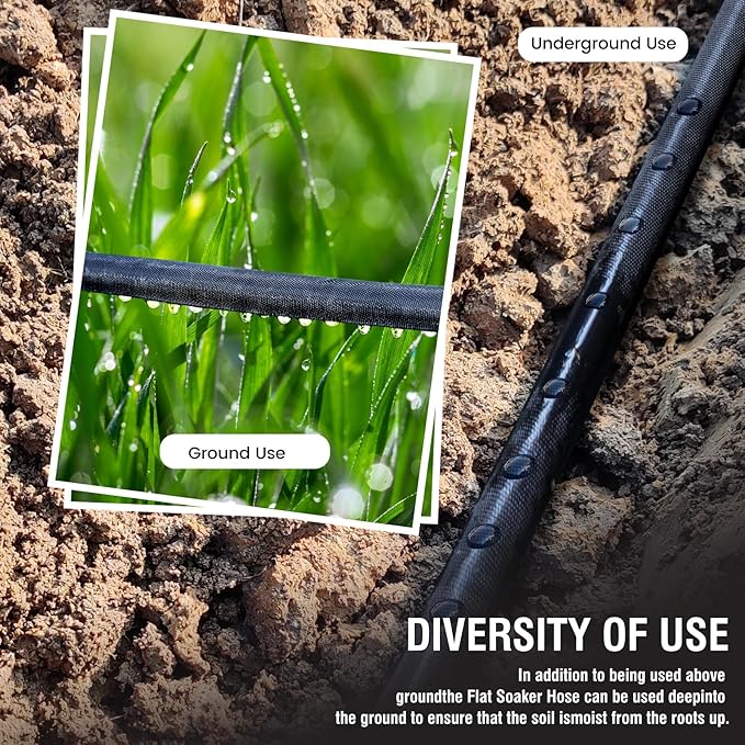 - 【Easy to Create an Irrigation System】The flat soaker hose can easy to place or move in your garden, which can be easily connected to a faucet or other hoses, and you can also connect it with a timer. You only need to install the hose, turn on the switch and it will automatically add water to the plants, making your irrigation easier and more effective. Easy installation makes it easier for you to build your irrigation system.