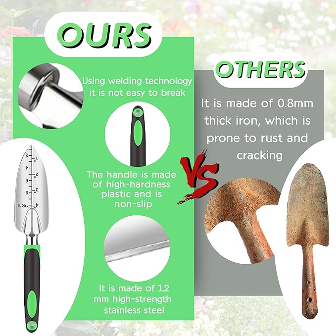 - Ergonomic Handle: After continuous testing by garden engineers, we combined our experience to design this more comfortable and labor-saving anti-slip TRP handle. Whether for children or seniors, the ergonomic design makes digging, carrying, weeding, planting, and pruning easier with these gardening hand tools, reducing hand pain and fatigue, their intuitive design provides Plenty of leverage. And we are equipped with gardening gloves, which can protect your hands very well.