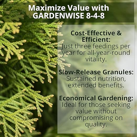 - ๐ต ECONOMICAL LONG-LASTING FORMULA: GARDENWISE 8-4-8 is not only cost-effective but also incredibly efficient, requiring just three feedings per year. Its slow-release granules ensure sustained nutrition and long-lasting benefits, making it an ideal choice for gardeners seeking an economical solution for maintaining their plants' health and vibrancy throughout the year.