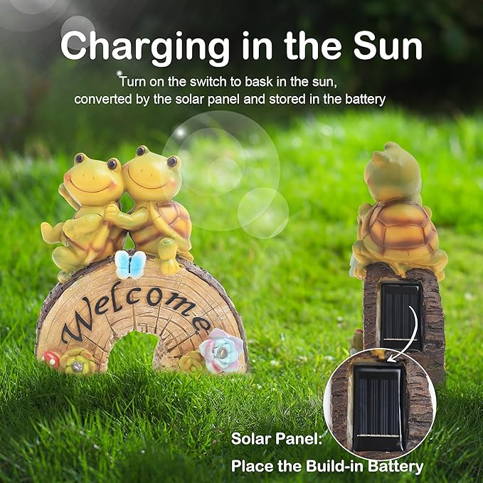 - 【Cute Lawn Decor】Frog Face Turtle solar statue is a great decoration for garden/ balcony/ patio/ yard/ lawn/ fence/ walkway, Frog-faced turtles sit on stumps and watch will make you welcoming us home every time you look them