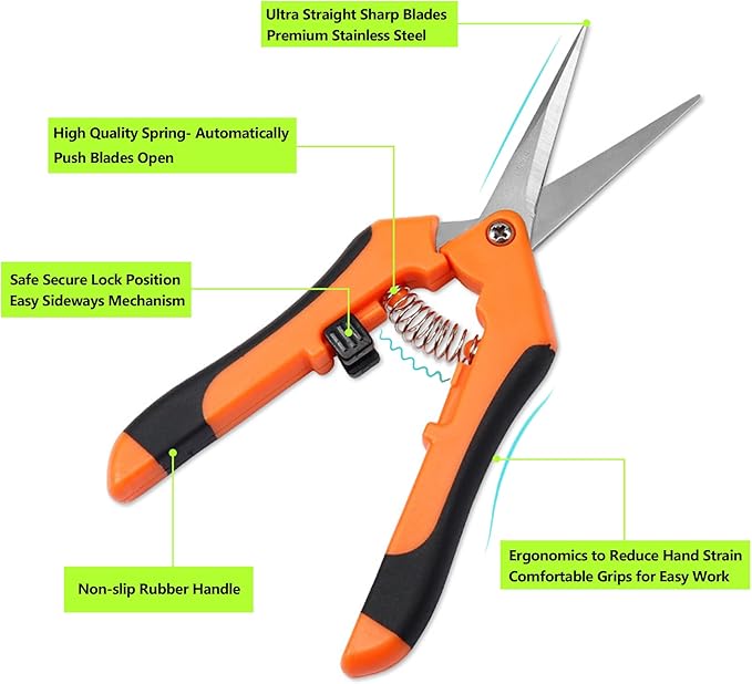 - Garden Scissors Hand Pruner: Reduce Hand Strain, Ultra Sharp Blades, Secure and Easy to Lock, Make Precise Cuts with Straight Stainless Steel Blades; 6.5 Inch plant shears, perfect as flower scissors trimming trees, shaping roses, annuals, vegetable, bonsai gardens. Plant scissors pruning pruners gardening garden clippers.