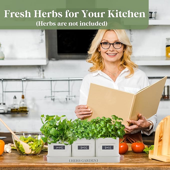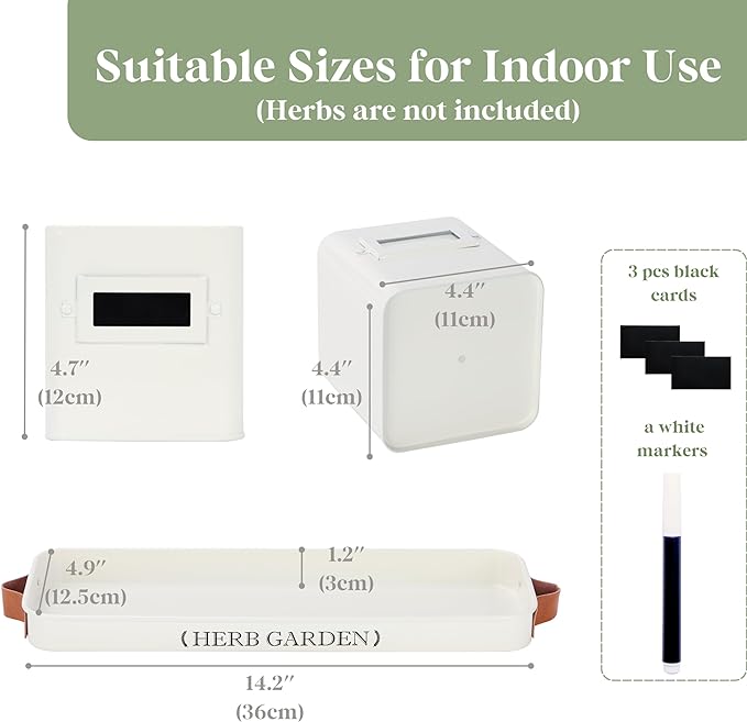- 【Windowsill Herb Garden】Our window herb garden includes three pots and a tray with a handle, with each pot measuring 4.4" W x 4.7" H, and the tray measuring 14.2" L x 4.9" W x 1.2" H. It's ideal for growing a variety of herbs such as mint, rosemary, basil, thyme, etc. Tailored for herb growth, our indoor herb pots provide an optimal environment for nurturing your herbs. Their farmhouse design and compact size make them perfect for placement on a windowsill or kitchen countertop.