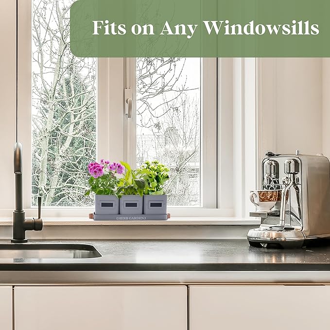 - 【Windowsill Herb Garden】Our window herb garden includes three pots and a tray with a handle, with each pot measuring 4.4" W x 4.7" H, and the tray measuring 14.2" L x 4.9" W x 1.2" H. It's ideal for growing a variety of herbs such as mint, rosemary, basil, thyme, etc. Tailored for herb growth, our indoor herb pots provide an optimal environment for nurturing your herbs. Their farmhouse design and compact size make them perfect for placement on a windowsill or kitchen countertop.