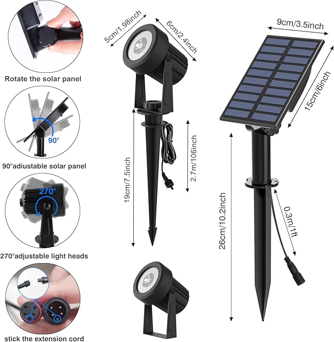 - Larger & Flexible Solar Panel: The larger solar panels provide higher photoelectric conversion rate up to 20%. You can rotate 90ยฐ up and down to capture sun energy effectively. Light head is 270ยฐrotatable to illuminate any place that would be out of reach