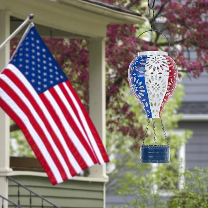 Solar Hot Air Balloon Lantern,Hanging Lantern Outdoor Waterproof Decorative Metal LED Solar Lights for Trees Patio Garden Yard Porch Decor, Flag