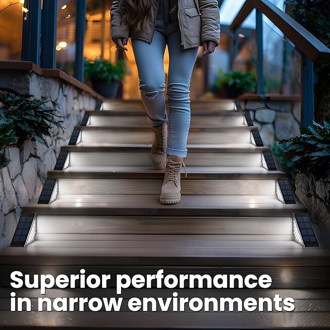 - 【Waterproof & Durable】This solar stair lights use high-quality ABS material and solar panel, waterproof switch and waterproof IP67, witch can withstand various extreme weather such as rain and snowweather