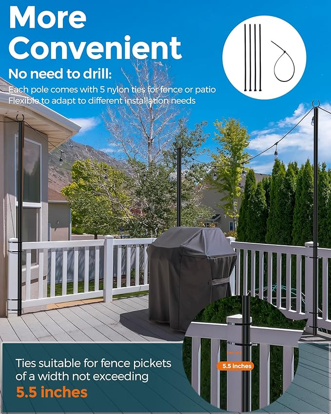 • 【DURABLE MATERIAL】This light string poles are made of heavy metal and coated with black outdoor waterproof and rustproof coating, which can withstand sun, rain, wind and snow.