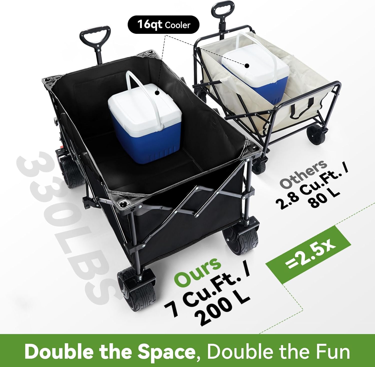 - ππππππ, πππππ πππππππ β You could hardly find a larger one. Our beach wagon with surprisingly enlarged capacity of 7 cubic feet / 200L is designed to be a real carryall. With a deeper and larger storage space, our wagon cart features 3-4 times the capacity of a 24-inch suitcase or 5-7 times of a 20-inch suitcase. Just load it with everything you need and enjoy a nice adventure in the sun!