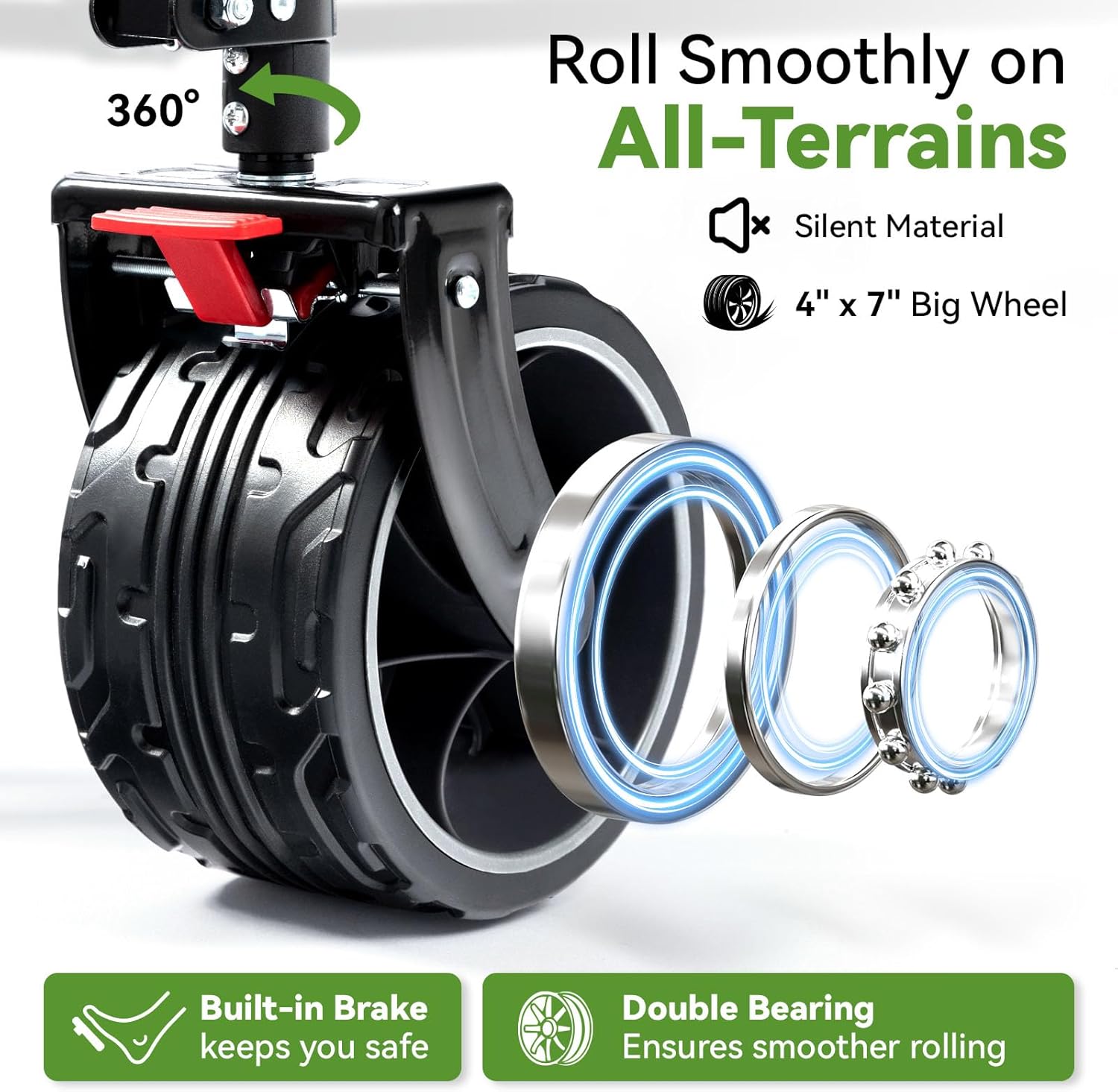 - πππππ ππππππ πππππππ πππ ππππππππ - Super large 4" wheels with unique anti-slip pattern make our collapsible wagon extremely capable of transporting load on multiple terrains, including sandy beach, grass and even rough terrains. The wheels of our beach cart are significantly wider than similar folding carts, resulting in dramatically better steering. The dual front wheels are 360-degree rotatable for easy maneuvering.