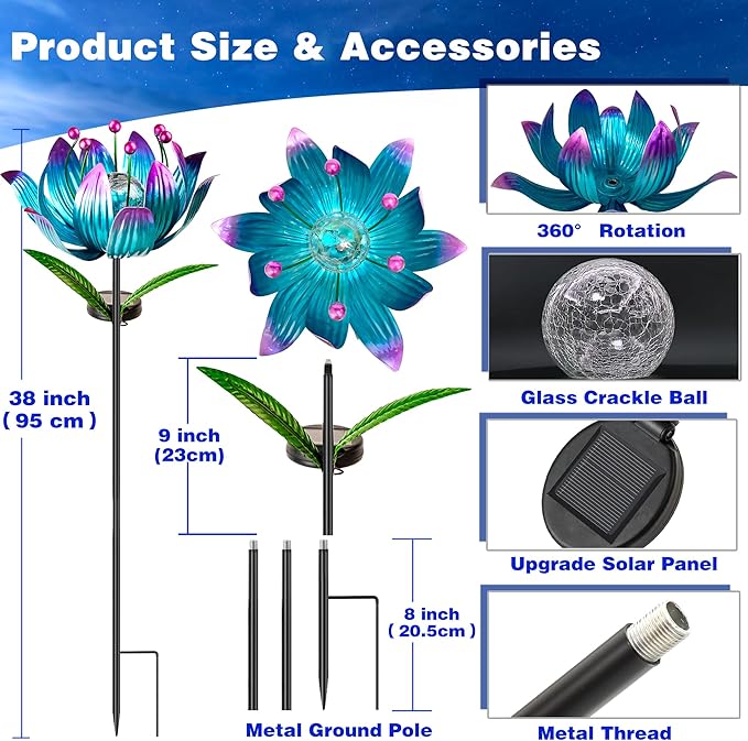 - 【 Solar Wind Spinners Outdoor 】Purple lotus flower lights wind spinner using waterproof LED burst spherical glass flower lights.It is beautiful and cute, it can decorate any place in the garden, it is beautiful during the day and at night, you can easily place and move it to any place you like!