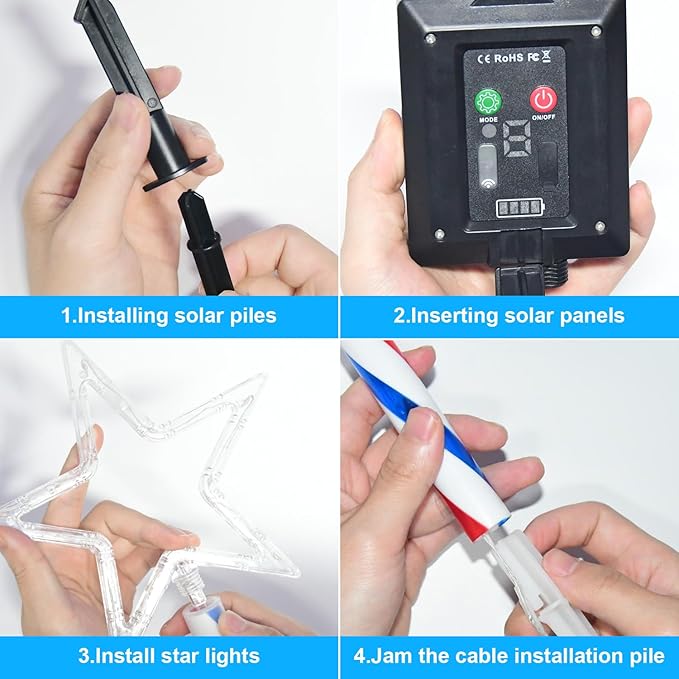- 【Remote Control And Timing Function】:Patriotic decorations 4th of July pathway lights with the remote control of the remote controller, you can easily turn on/off the star string lights;8 different lighting modes;4 levels of adjustable brightness;3 timer modes. The pathway solar lights outdoor waterproof are bright and colorful, and the different light patterns increase the visual appeal of the Memorial Day Independence Day outdoor display, a great choice for your fourth of July decor.