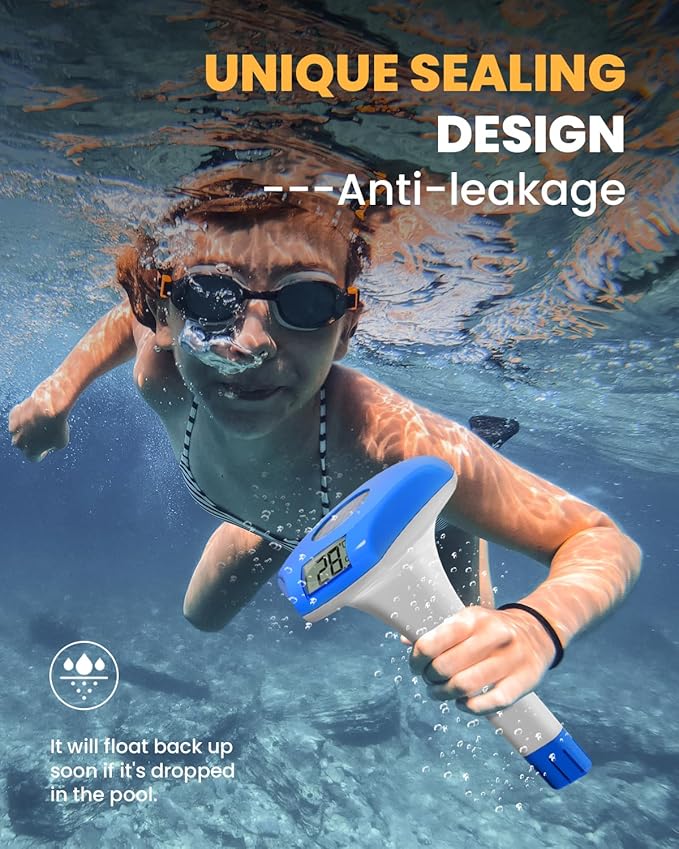 - 🍇UNIQUE SEALING DESIGN: BALDR pool thermometer features an integrated molding technique that enhances its waterproof performance to an IPX8 rating. By sealing all open spaces, it provides complete protection against leaks, ensuring the thermometer remains dry.