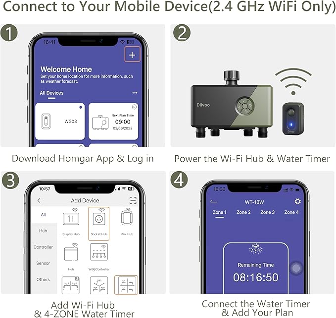 - Remote and Voice Control: With the HomGar app, you can add your Diivoo smart water timer to your WiFi gateway (only supports 2.4 GHz WiFi). Diivoo smart 4 zone hose timer is compatible with Alexa and Google Assistant to make your life easier by simplifying your irrigation efforts