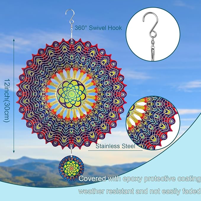 - PERFECT SIZE AND 360ยฐ ROTATING: Measuring 12"W x 12"H.Our portable art wind spinners easy to unfold, twist and hang,The convenient metal S-shaped swivel hook will help us experience the mesmerizing beauty of our wind spinners as they gracefully rotate 360 degrees with the slightest breeze. This gentle motion creates a captivating display, adding a sense of tranquility and relaxation to your outdoor or indoor space.